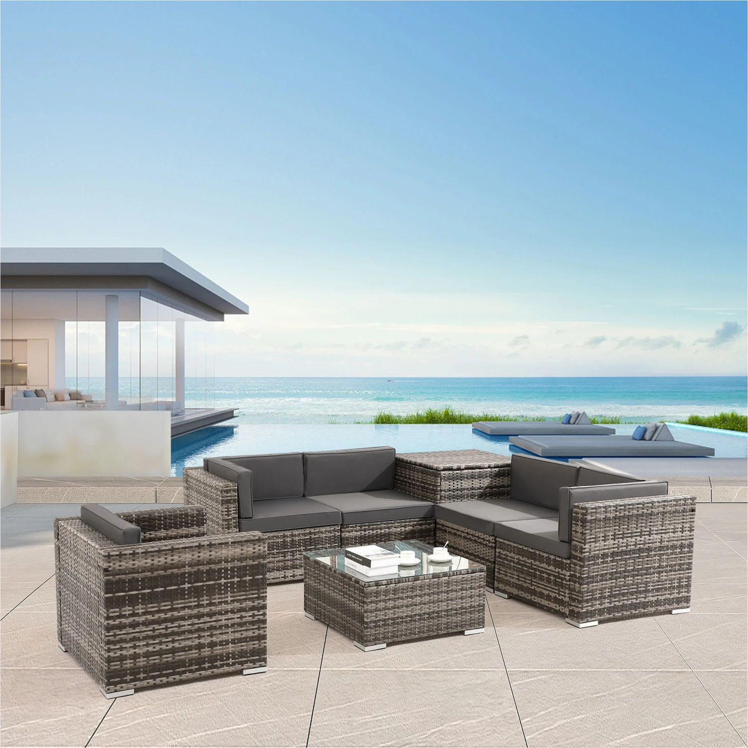 Dieses ästhetisches Sitzgruppen-Set aus Poly-Rattan kombiniert Design und Funktionalität. Darüber hinaus wird das Set garantiert zum Mittelpunkt Ihres Gartens oder Ihrer Terrasse. Die absolut perfekte Wahl, um sich vollständig zu entspannen und das Wetter im Garten oder auf der Terrasse zu genießen. Dank des witterungsbeständigen und wasserdichten PE-Rattans ist die Sitzgruppe strapazierfähig, wartungsarm und ideal für den ganzjährigen Einsatz im Freien geeignet.