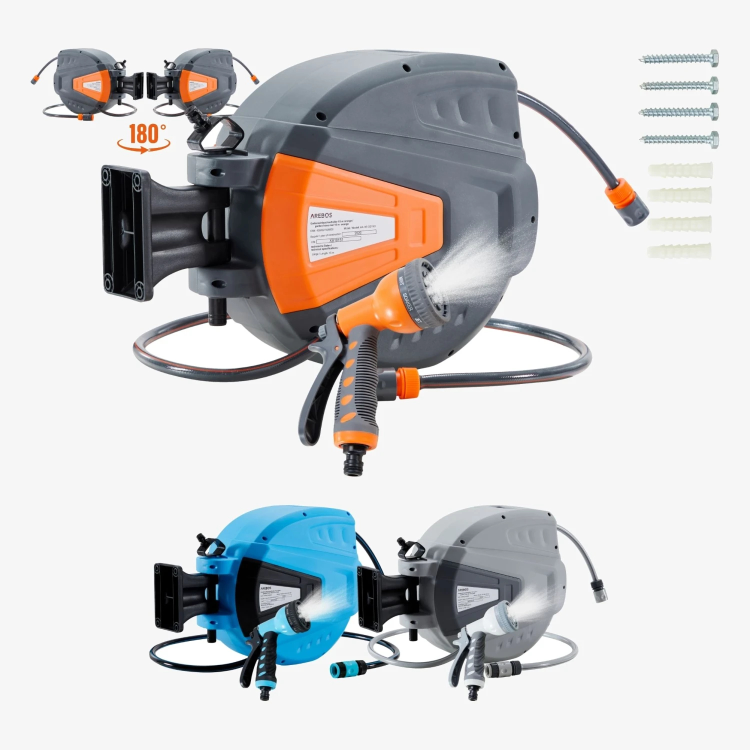 Unsere AREBOS Gartenschlauchaufroller finden Sie in den Farben grau, blau, orange in den jeweiligen Schlauchlängen: 15 m, 20 m und 30 m