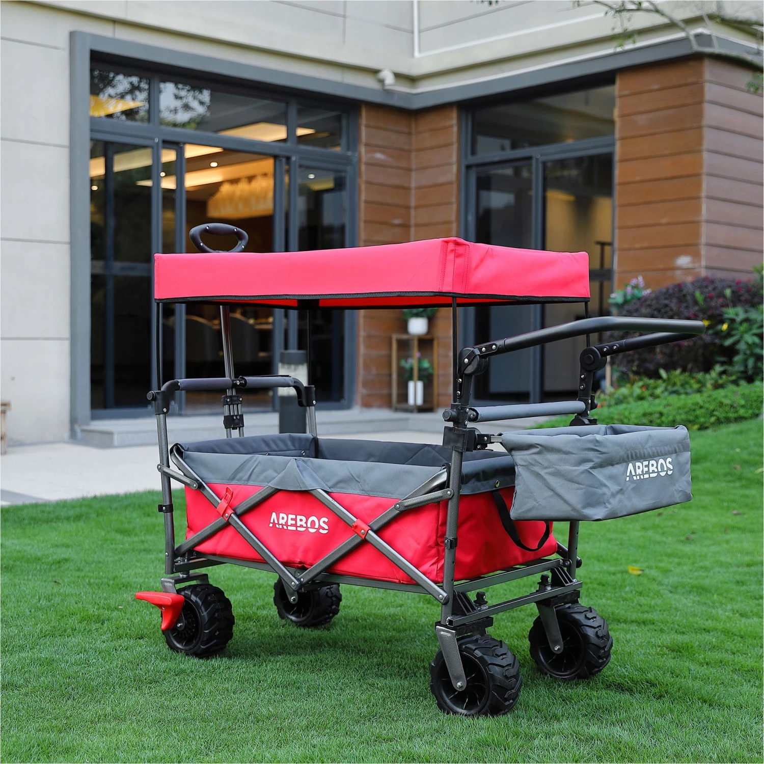 Ein abnehmbares Sonnendach und die abnehmbare XXL-Tasche an der Rückseite und zwei Getränkehalter an der Vorderseite bieten wertvollen zusätzlichen Stauraum. Die Vorderachse dieser Transportkarre ist mit 4-Wege-Rädern ausgestattet, um eine einfache Steuerung zu ermöglichen.