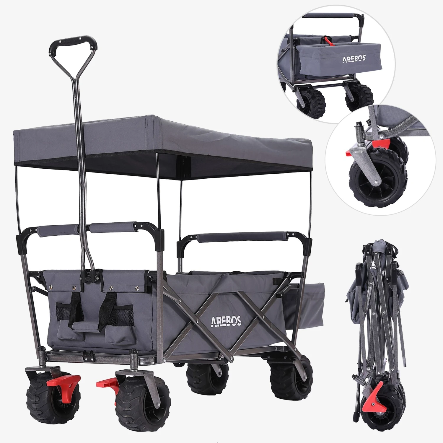 Ein abnehmbares Sonnendach und die abnehmbare XXL-Tasche an der Rückseite, zwei Getränkehalter an der Vorderseite bieten wertvollen zusätzlichen Stauraum. Die Vorderachse dieser Transportkarre ist mit 4-Wege-Rädern ausgestattet, um eine einfache Steuerung zu ermöglichen.