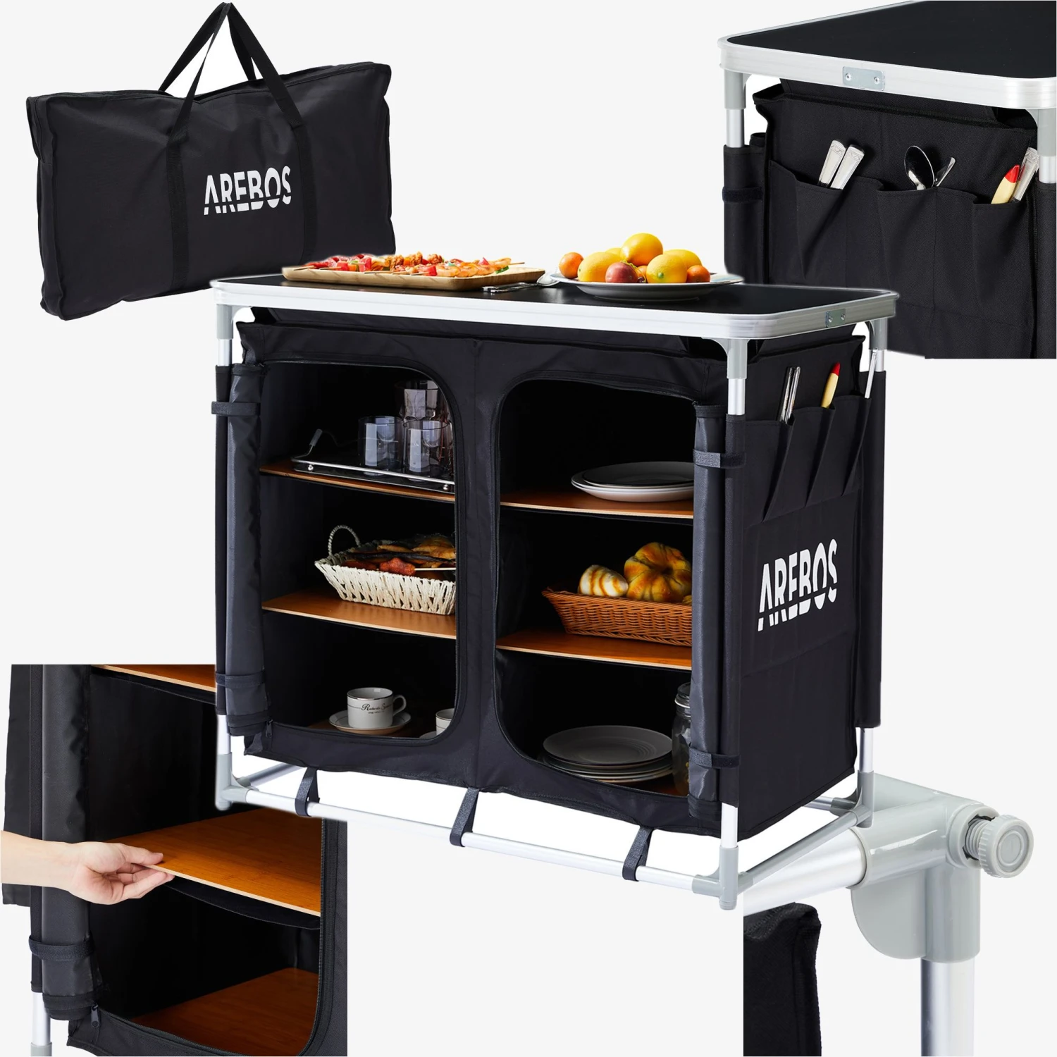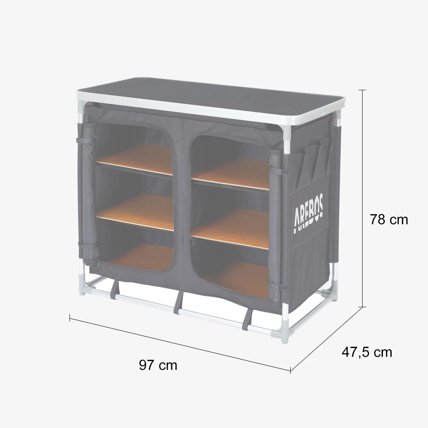 Unser AREBOS Campingschrank ist nicht nur sehr solide konstruiert sondern ist durch das Aluminiumgestell – mit 4,5 kg Eigengewicht – auch sehr leicht! Darüber hinaus gehört zum Lieferumfang des AREBOS Campingschranks eine Aufbewahrungstasche, die den Transport des Schranks noch einfacher macht.