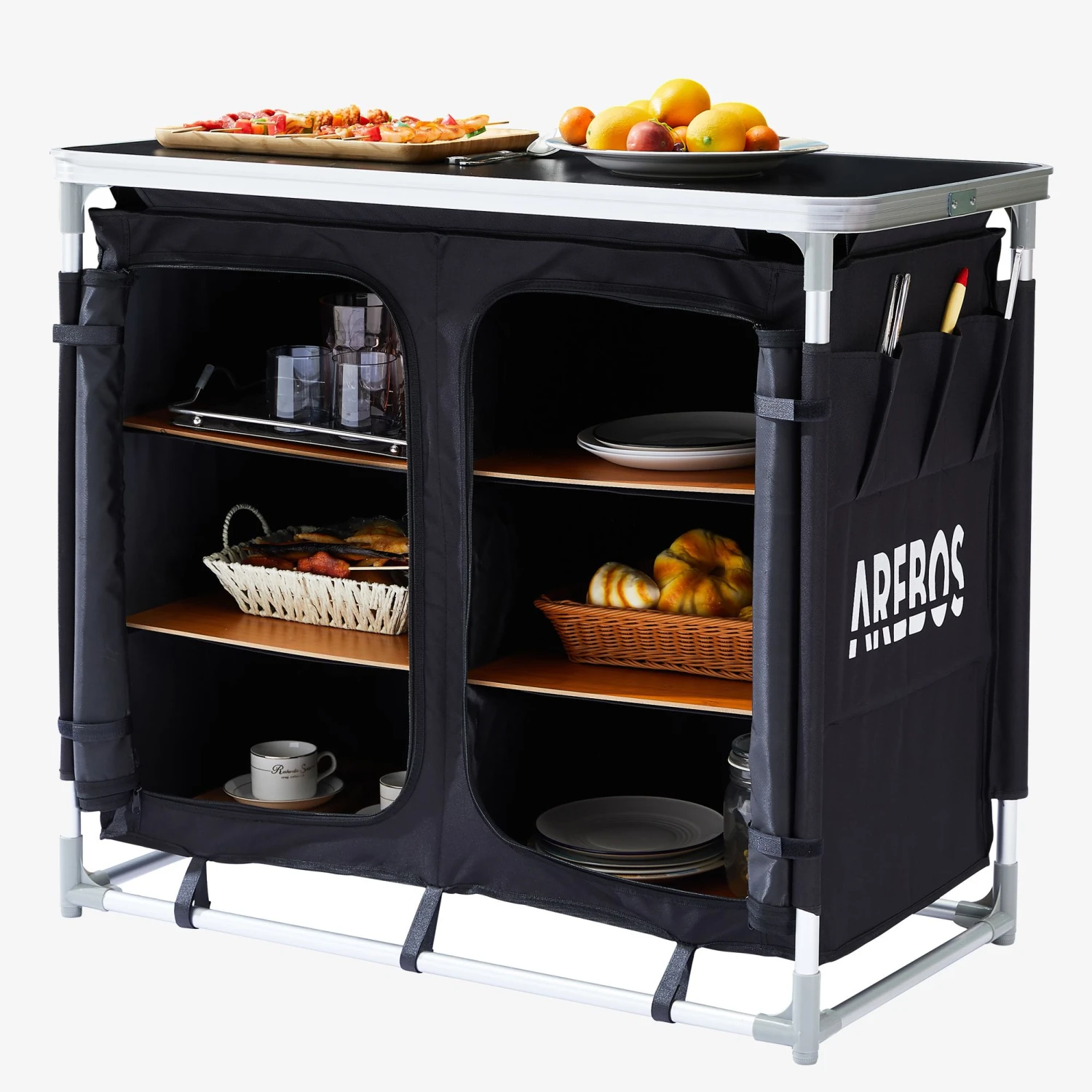 Eine handliche Campingküche kann das Kochen auf dem Campingplatz wesentlich angenehmer machen. Die AREBOS Campingküche verfügt über viel Stauraum, in dem Sie alle Ihre Küchenutensilien aufbewahren können. Auf der linken und rechten Seite des Schranks befinden sich Ablageflächen, in dem Sie beispielsweise Ihre Küchenutensilien aufbewahren können.