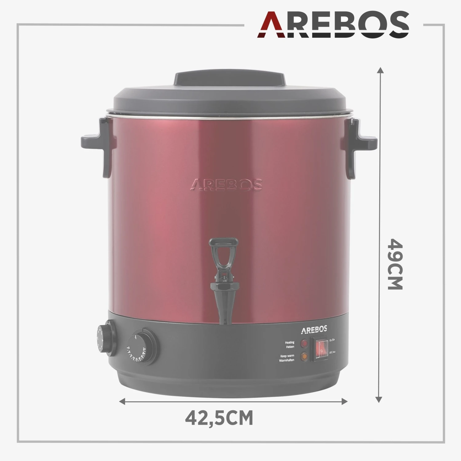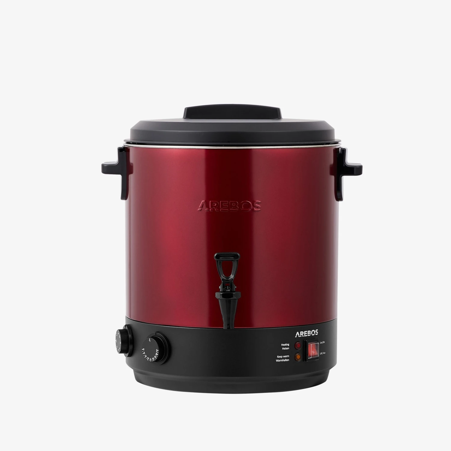 Durch die verdeckten Heizelemente können aber auch Speisen wie Gulasch zubereitet und warmgehalten werden. Auch als Heißgetränkespender glänzt der AREBOS Einkochautomat mithilfe des praktischen Ablasshahns. Egal ob Glühwein oder Glühbier, Kaffee oder Tee, verschiedenste Getränke lassen sich treffsicher abfüllen.