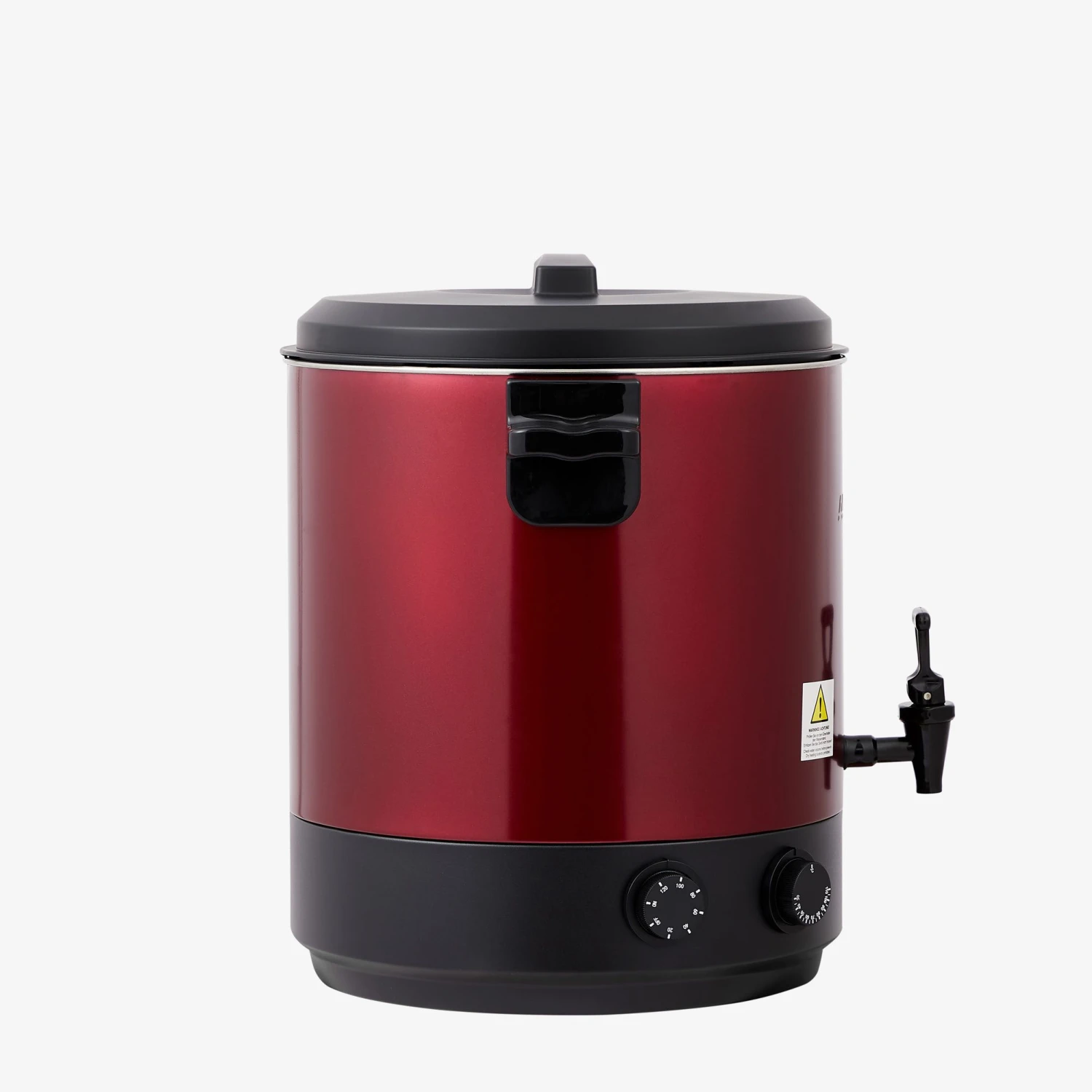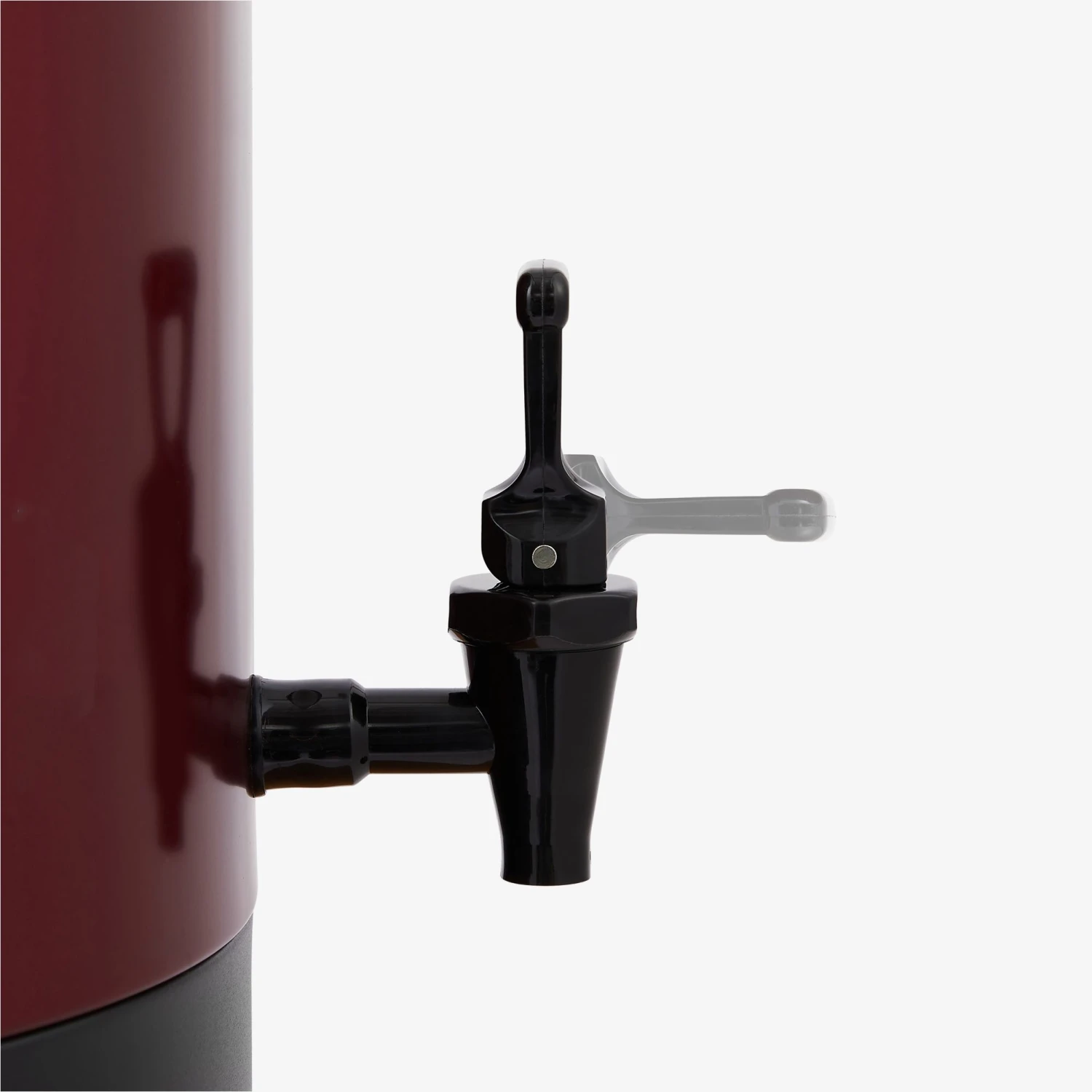 Der Zapfhahn an der Vorderseite erlaubt das Ausschenken von heißen Flüssigkeiten, kann aber ebenso zum Ablassen des Inhalts genutzt werden. Da der Topf aus gebürstetem Edelstahl besteht und im Inneren nur über glatte Oberflächen verfügt, ist er sehr einfach mit gängigen Reinigungsmitteln zu säubern.