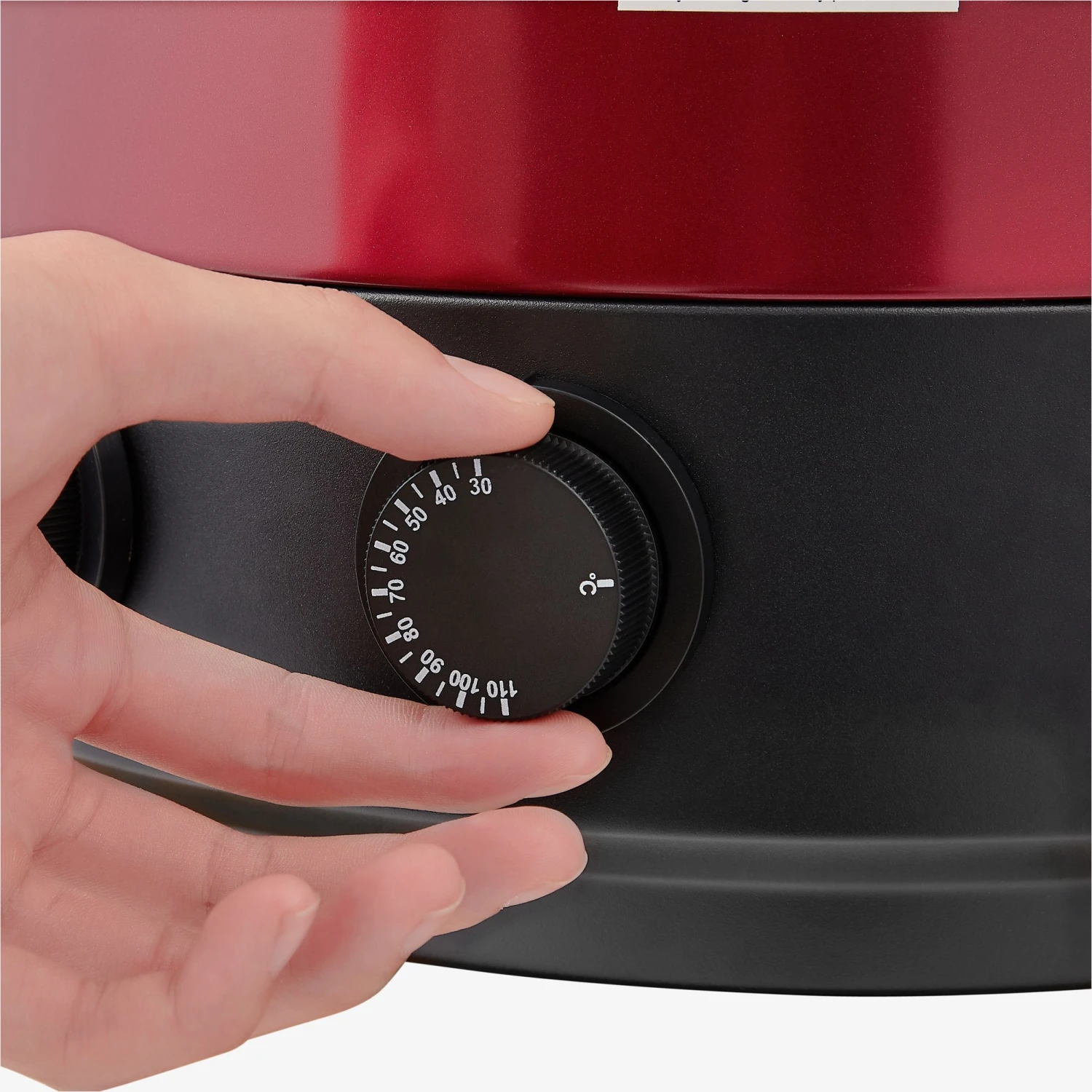 Die Cool-Touch Griffe aus wärmeisoliertem Material lassen den Behälter sicher umplatzieren. Mithilfe des Temperaturreglers von 30 – 110 °C kann die Temperatur je nach Bedürfnis eingestellt werden. Durch den Überhitzungsschutz schaltet sich das Gerät bei Überhitzung automatisch ab.