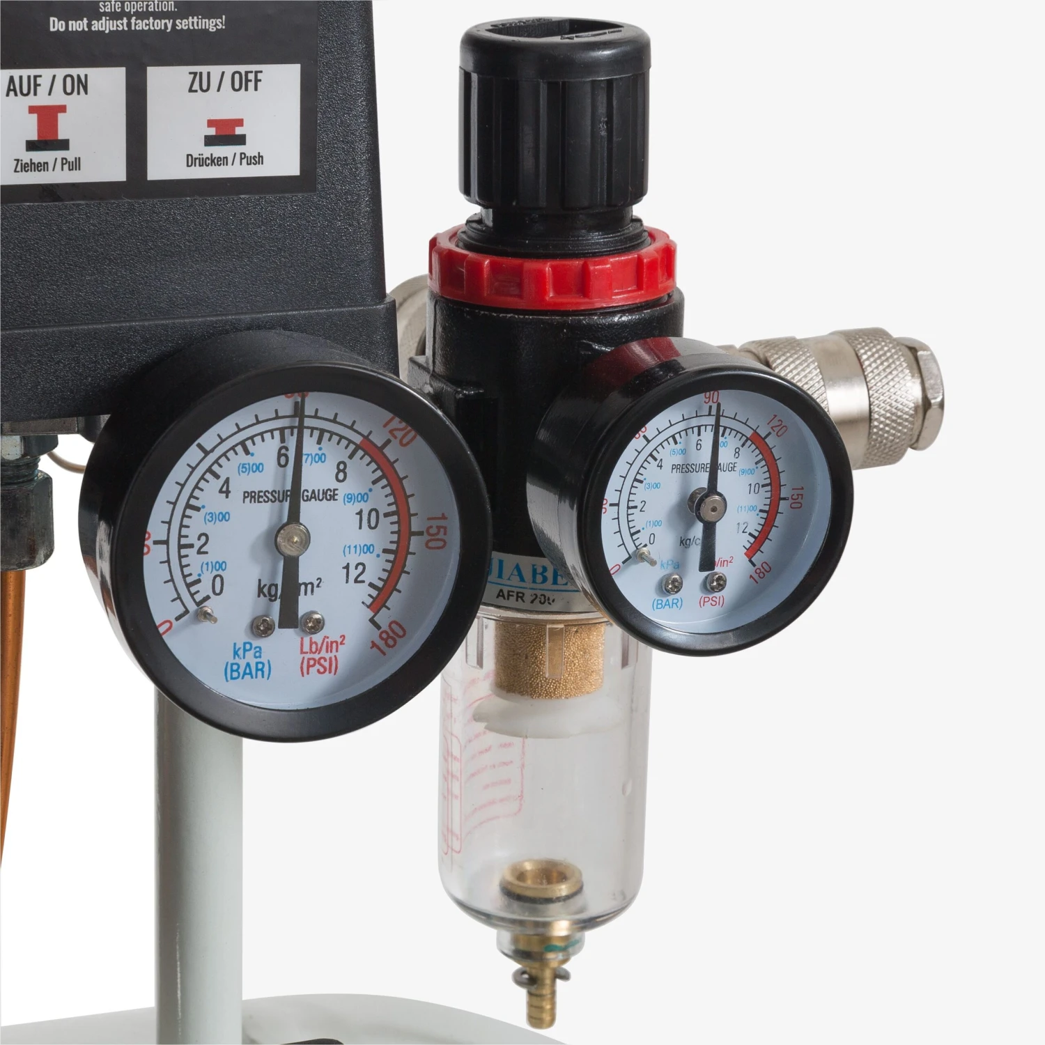 Die besonders effektive Arbeitsweise wird zudem durch einen eingebauten Ansaug-Luftfilter unterstützt, welcher das Einsaugen von Staub und Schmutz verhindert. Der Druckminderer ermöglicht die Automatische Zuschaltung bei Druckbedarf.