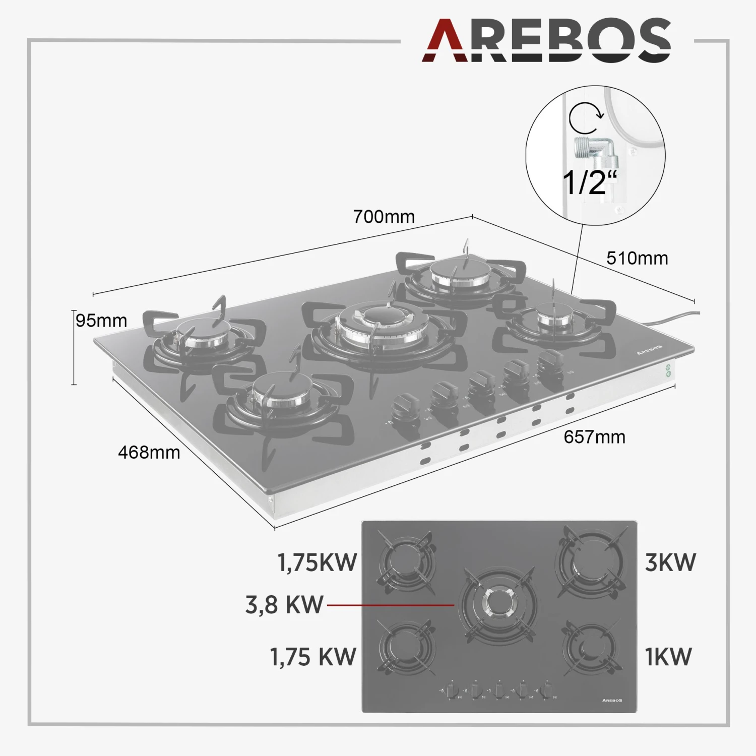 Das AREBOS Kochfeld ist mit einer Zündsicherung ausgestattet, welche einen weiteren Gasfluss nach erloschener Flamme unterbindet und somit Sie und Ihre Liebsten schützt.