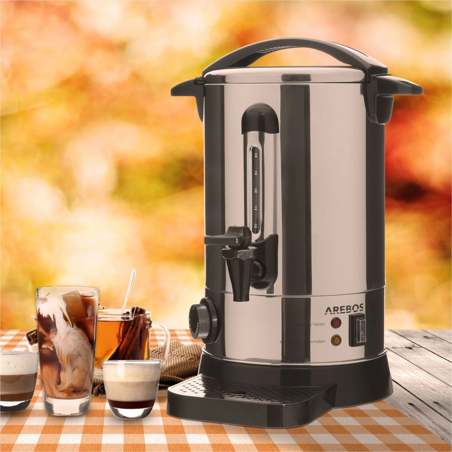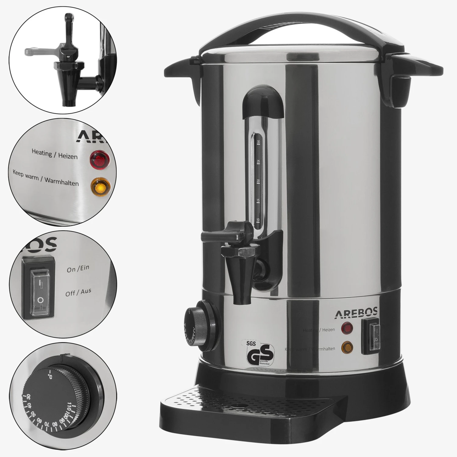 Mit dem hochwertigen 950 W Glühweinkocher von AREBOS versüßen Sie sich erfolgreich die kalte Jahreszeit. Der professionelle Heißwasserspender bietet Ihnen ständige Erwärmung und komfortable Zubereitung von Heißgetränken wie Tee, Kaffee oder Glühwein und Glühbier. Das Gerät ist sowohl für die Gastronomie als auch für den privaten Gebrauch geeignet.