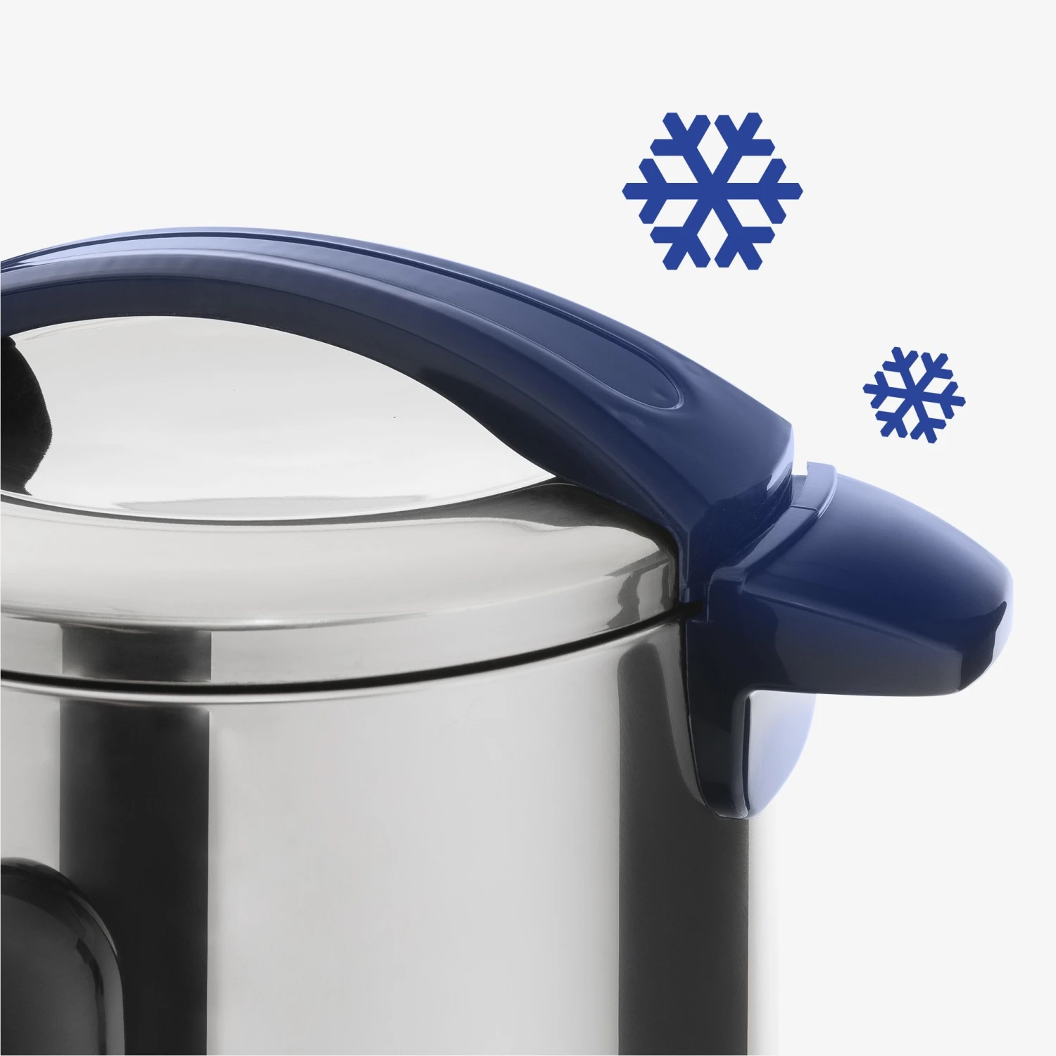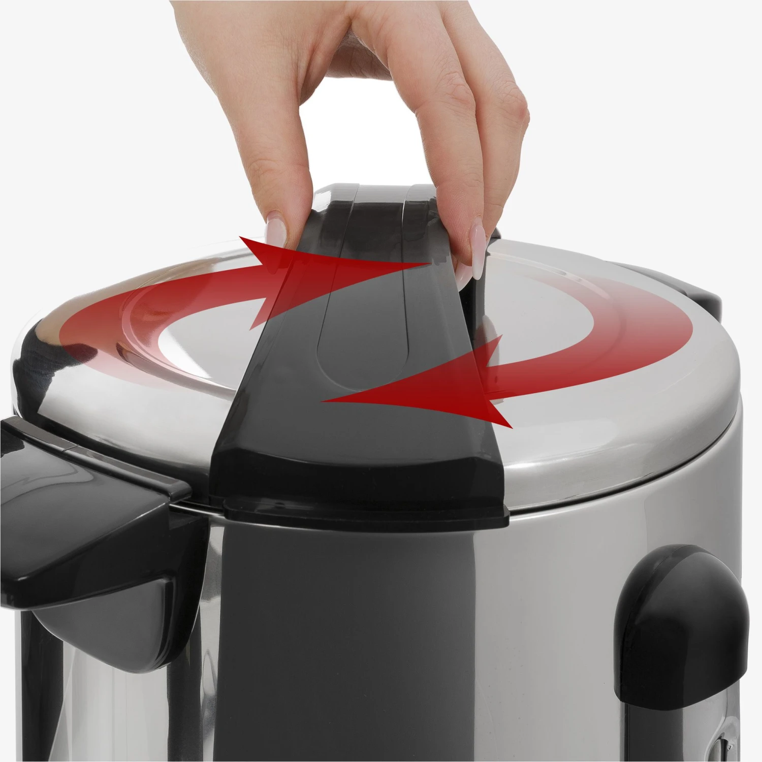 Aufgrund des stabilen Standfußes, der breiten und wärmeisolierten Griffe sowie des verschließbaren Edelstahl-Deckels sorgen wir für zusätzliche Sicherheit und verhindern ein Umkippen des Glühweinkochers.
