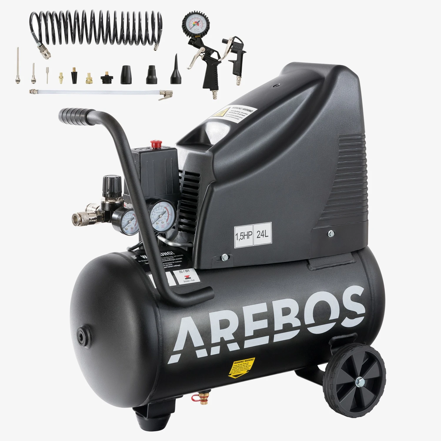 Der AREBOS 24 Liter Druckluftkompressor ist ideal geeignet zum Erzeugen von Druckluft für druckluftbetriebene Werkzeuge, wie beispielsweise Aufblaspistolen und Reifenfüller.