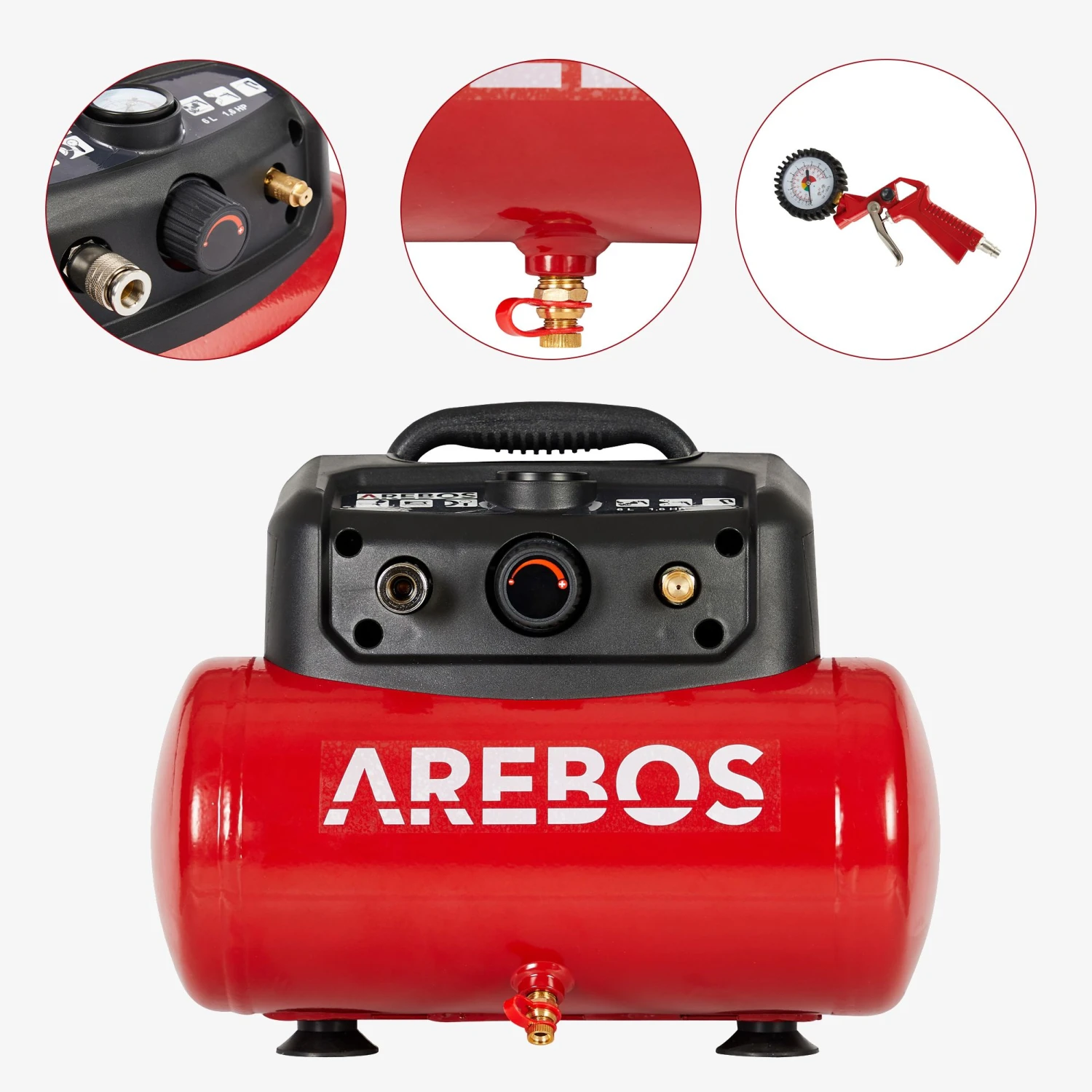 Der AREBOS 6 Liter Druckluftkompressor ist ideal geeignet zum Erzeugen von Druckluft für druckluftbetriebene Werkzeuge, wie beispielsweise Aufblaspistolen und Reifenfüller.