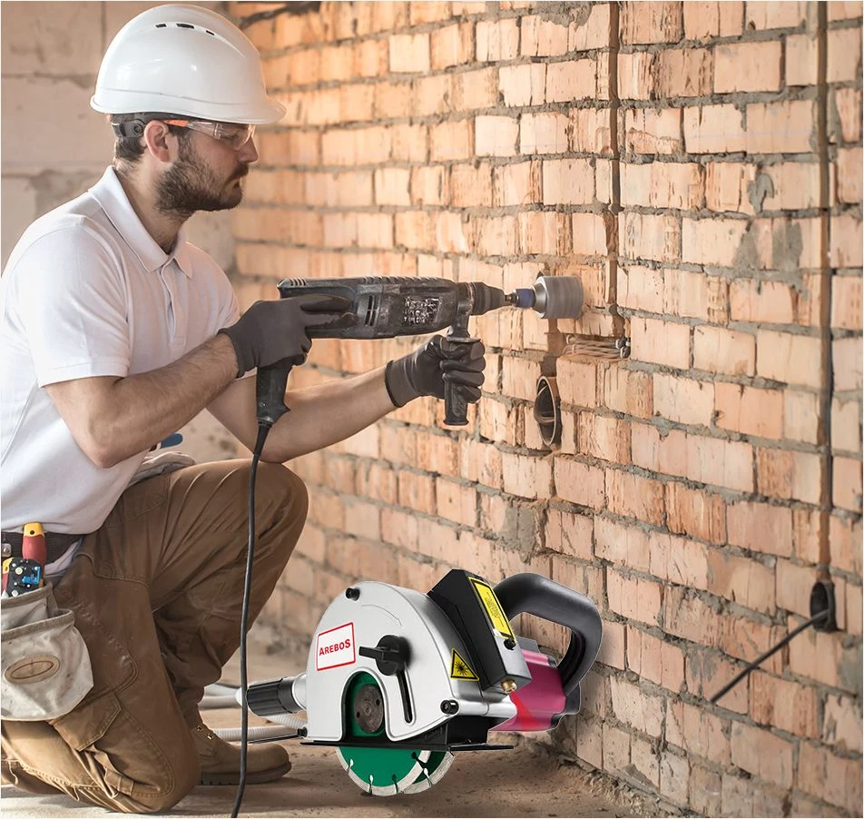Profi Mauernutfräse mit Laserschnittlinienanzeige. Stufenlose Schnitttiefenverstellung von 10-40 mm sowie fest arretierbare Nutbreiten.