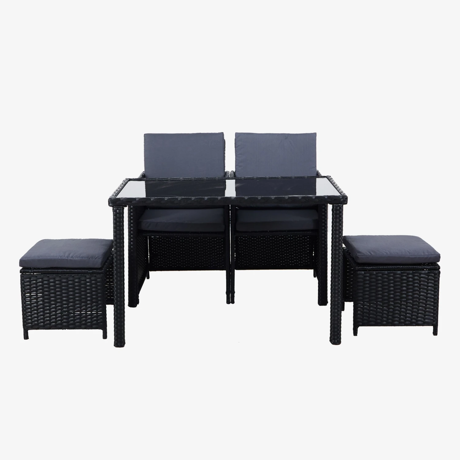 Bestehend aus vier Stühlen, vier Hocker und einem Tisch aus zwei edlen Glasplatten, bietet dieser Esstischgarnitur genug Platz für die ganze Familie. Polyrattangeflecht ist ein langlebiges, unempfindliches Material und eignet sich daher optimal für die Herstellung von Gartenmöbeln. Dank der qualitativ hochwertigen Verarbeitung werden Sie lange Freude an diesem Set haben!