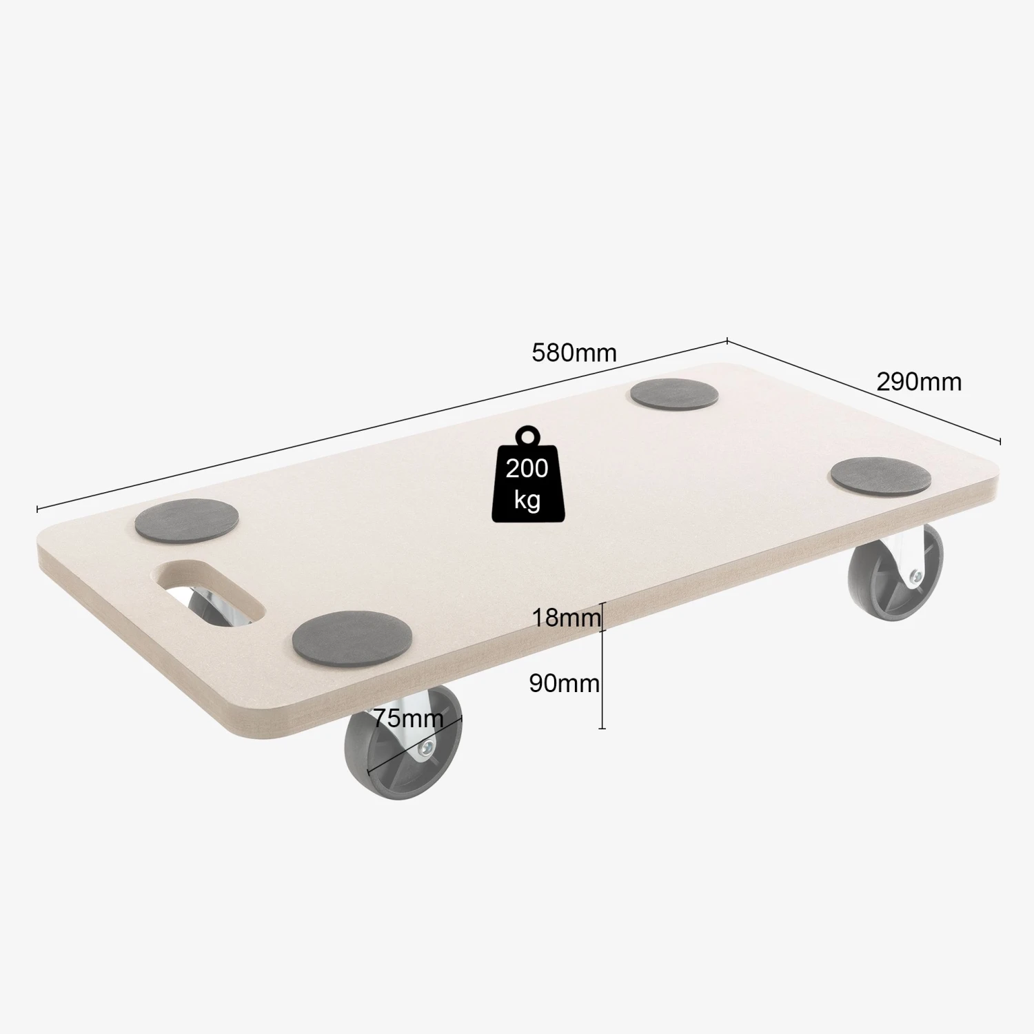 Das MDF Brett ist mit vier praktischen Gummipads versehen, sodass ein Verrutschen des Transportgutes verhindert und Verletzungen vorgebeugt werden kann. Zudem schonen die Gummipads das zu transportierende Gut, da sie als Puffer fungieren.