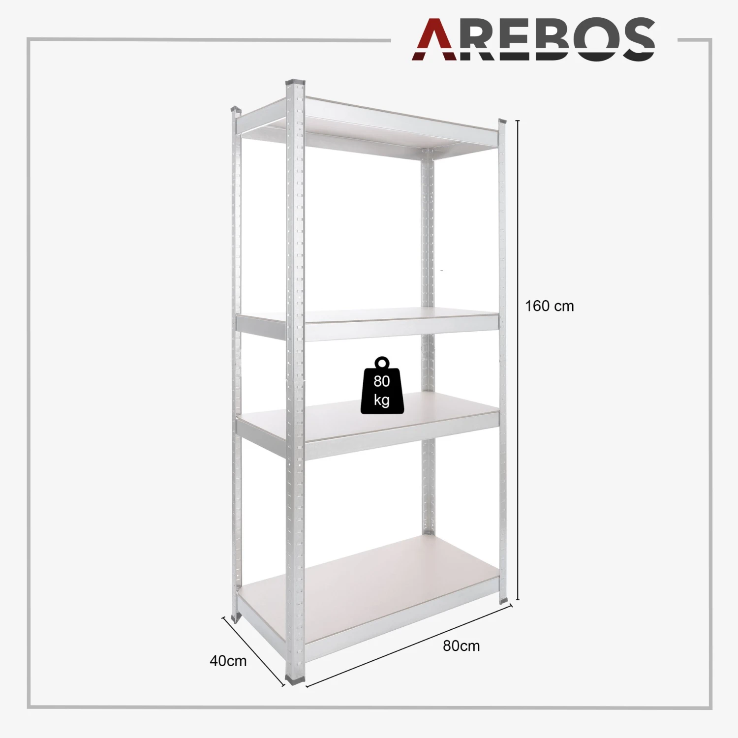 Dank unserem AREBOS Schwerlastregal gehört Unordnung der Vergangenheit an. Die 4 individuell einteilbaren Böden bieten ordentlich Stauraum für Ihre Werkzeuge, Gartengeräte, Nahrungsmittelvorräte oder Ähnlichem.