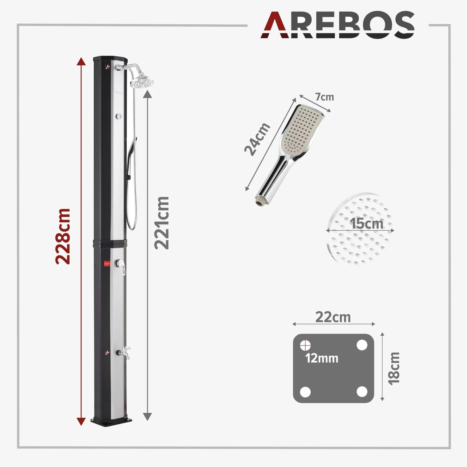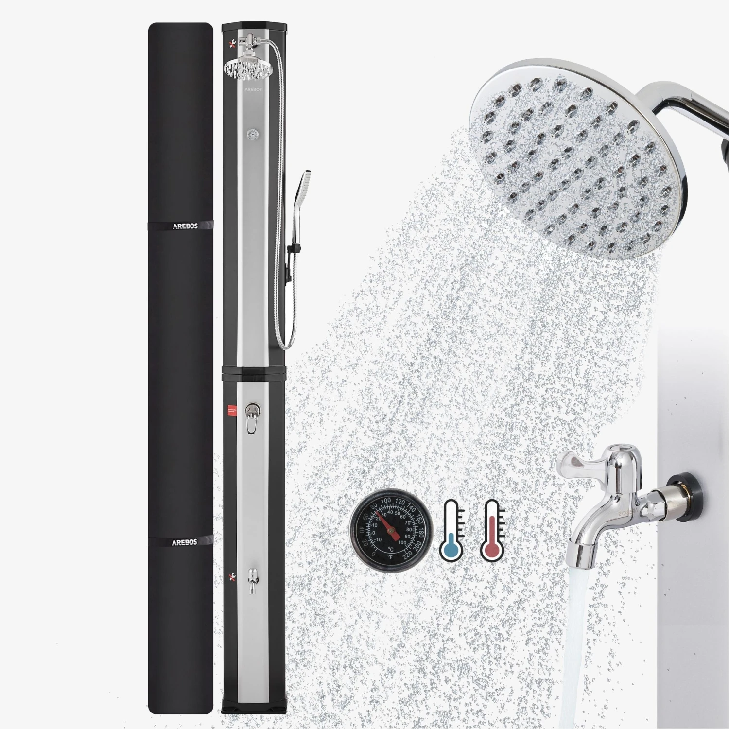 AREBOS Solardusche 60 L mit Thermometer und Handbrause