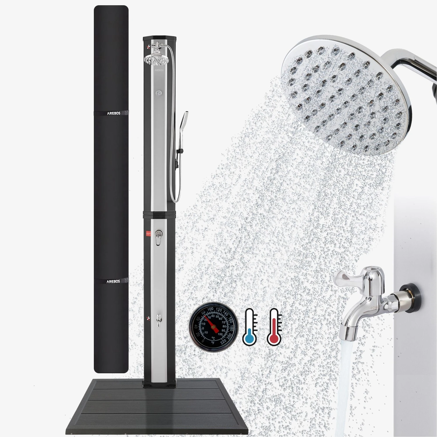 AREBOS Solardusche 60 L mit Thermometer, Handbrause & Bodenelement