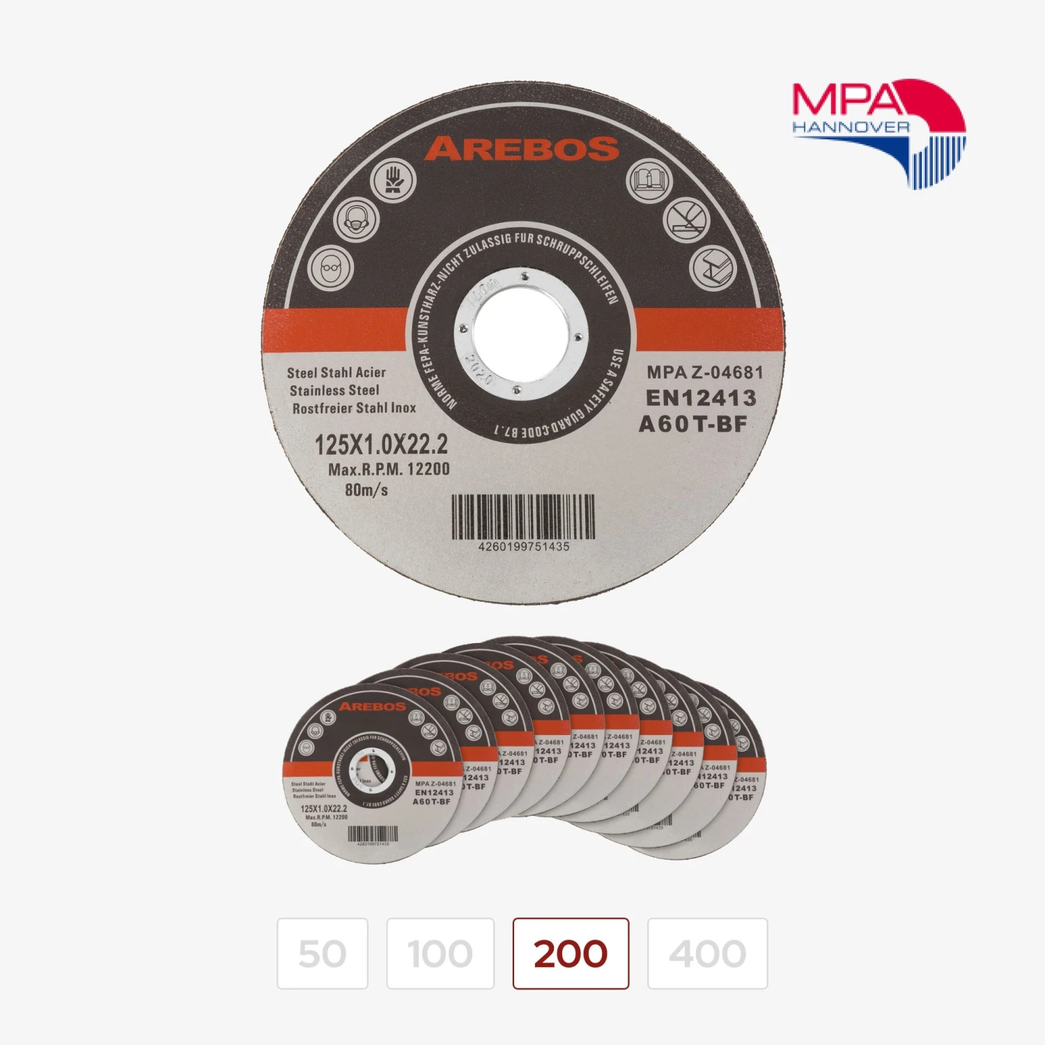 Unsere Trennscheiben erfüllen die Sicherheitsstandards der EN 12413 (Europäische Norm 12413). Dies wurde vom Materialprüfungsamt (MPA) Hannover getestet und bestätigt.