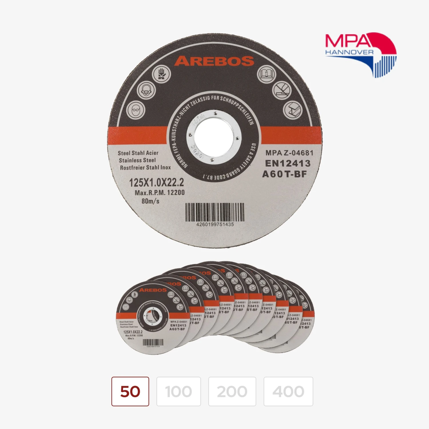 Die AREBOS Trennscheiben vereinen Sicherheit, Geschwindigkeit und Qualität in einem Produkt. Testen Sie unsere Trennscheiben und überzeugen Sie sich, wie bereits viele Kunden vor Ihnen, von den tollen Ergebnissen, die Sie mit unseren Trennscheiben erzielen können.