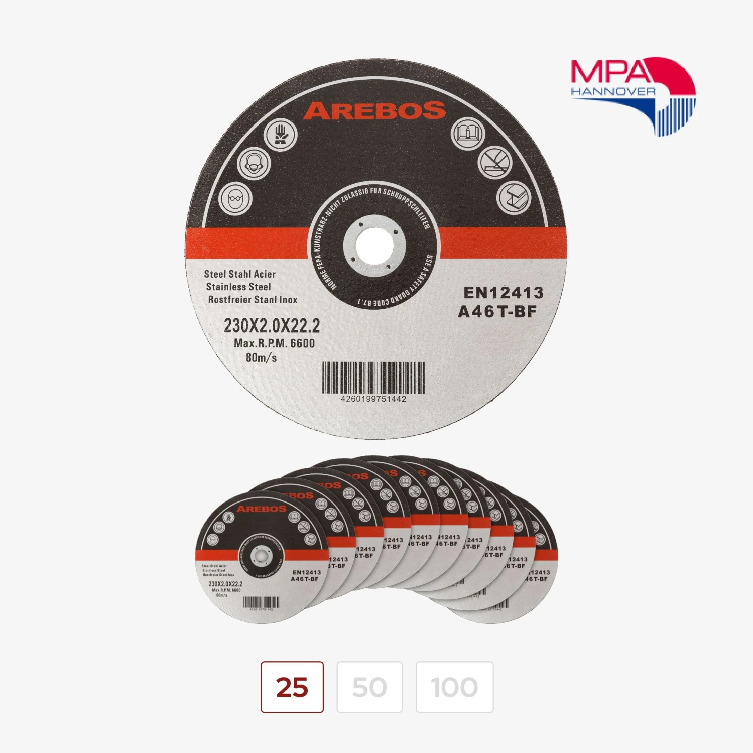 Die AREBOS Trennscheiben vereinen Sicherheit, Geschwindigkeit und Qualität in einem Produkt. Testen Sie unsere Trennscheiben und überzeugen Sie sich, wie bereits viele Kunden vor Ihnen, von den tollen Ergebnissen, die Sie mit unseren Trennscheiben erzielen können.