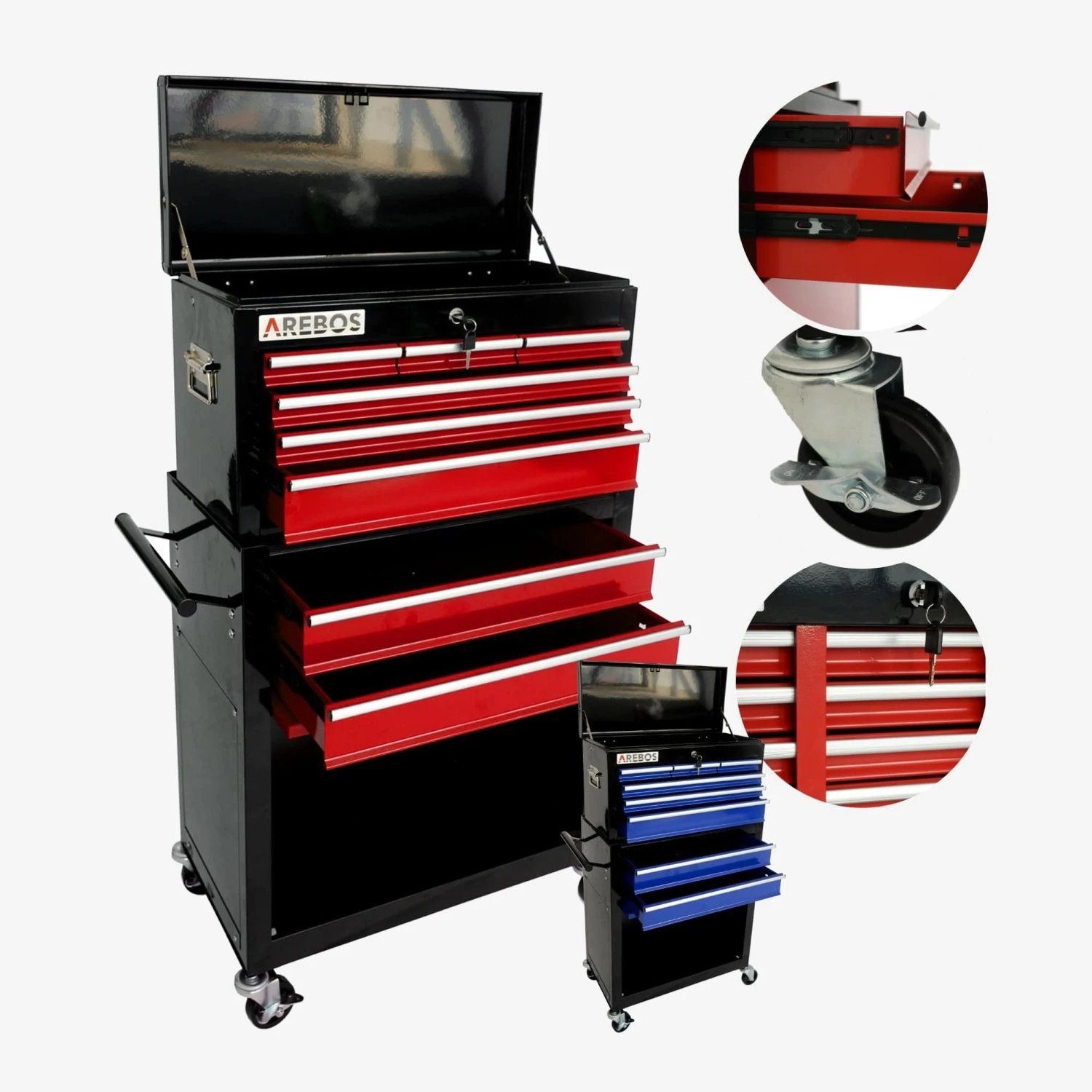 AREBOS Werkzeugwagen – mit 8 Schubladen, einem aufklappbaren Fach sowie einem Kabinett